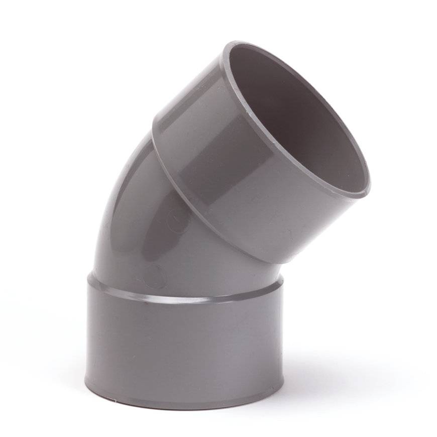 PVC Bocht 45gr, Ø 110mm mof/mof - lijm. De PVC bocht 45 graden met lijmverbinding is verkrijgbaar in de maten Ø 32mm t/m 200mm, met KOMO keurmerk.
