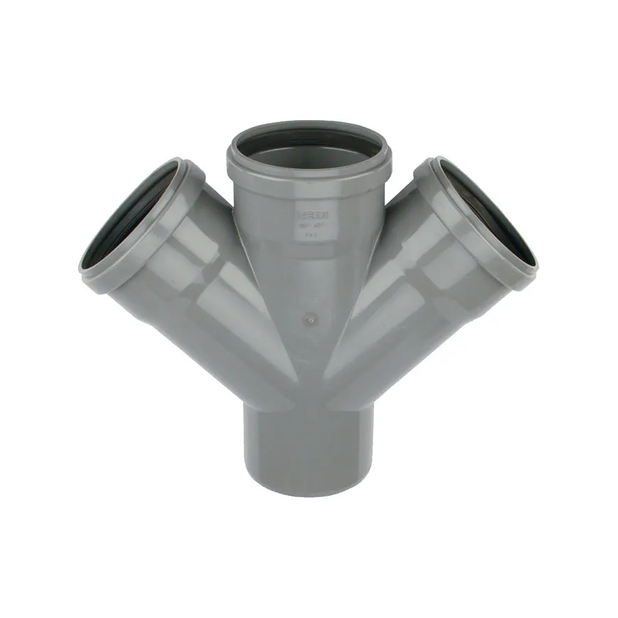PVC T-stuk dubbel 45 graden 110 mm SN4 (3 x manchet/ 1 x spie) geeft de mogelijkheid om een dubbele opsplitsing te maken vanaf een leiding. Het hulpstuk is voorzien een KOMO keurmerk.