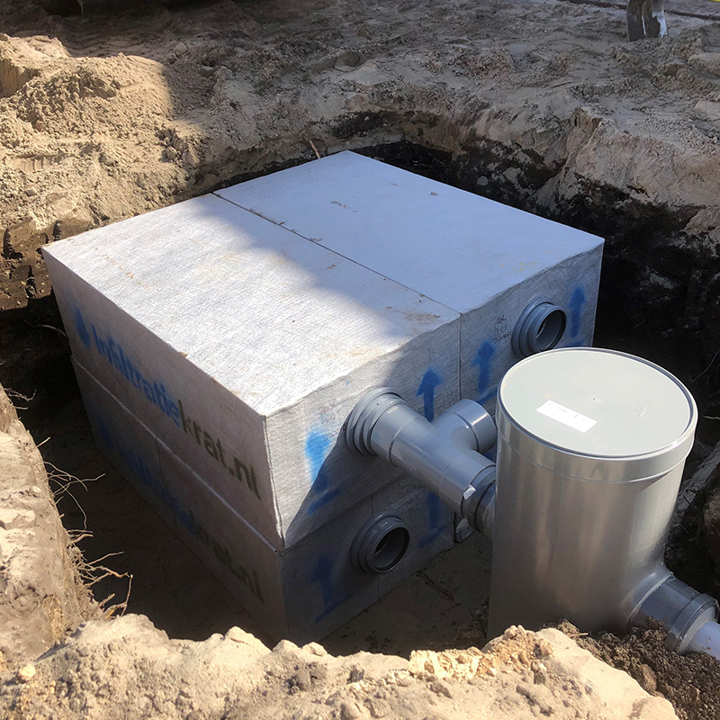 Afhankelijk van de benodigde capaciteit heb je een bepaalde aantal infiltratiekratten nodig. Deze kratten moeten in de grond geplaatst worden. Bedenk daarom van te voren goed waar je de infiltratiekratten wilt plaatsen. Heb je beperkte ruimte, dan kan je er ook voor kiezen om op meerdere plekken kleinere kratten te plaatsen. Deze kun je met elkaar verbinden of allemaal een losse aanvoer geven. Houd er bij een losse aanvoer wel rekening mee dat alle kratten voorzien moeten worden van een zandvangput. Dit zorgt ervoor dat er alleen 'schoon' water de krat in stroomt.
